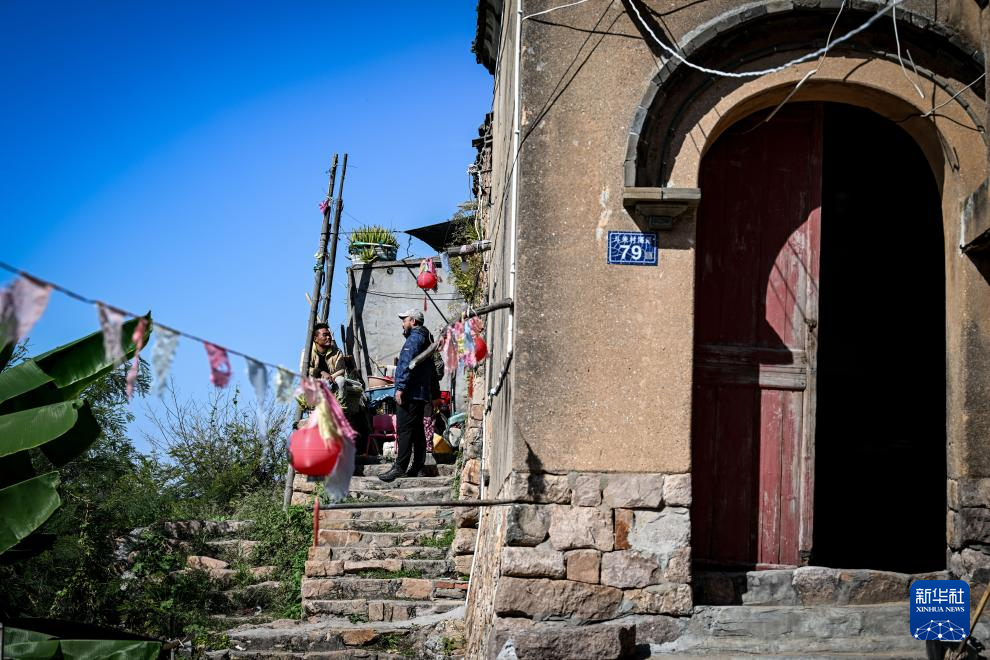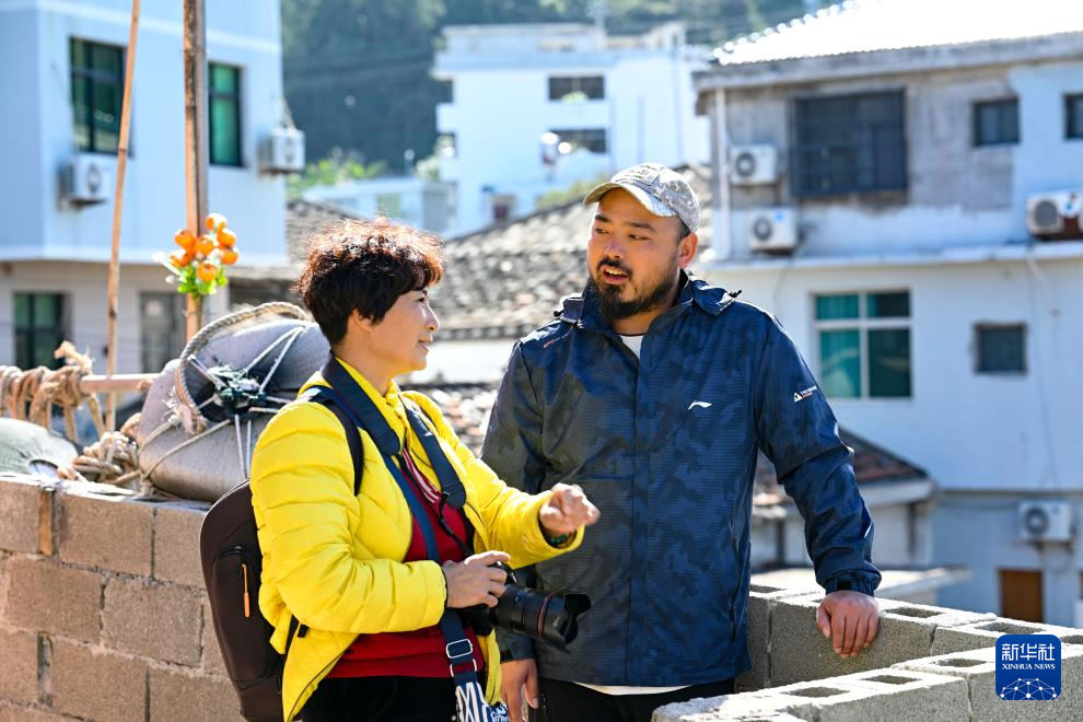 11月30日,在家乡霞浦县长春镇斗米村海尾自然村,姜瑜(右)与从安徽来的游客交流。