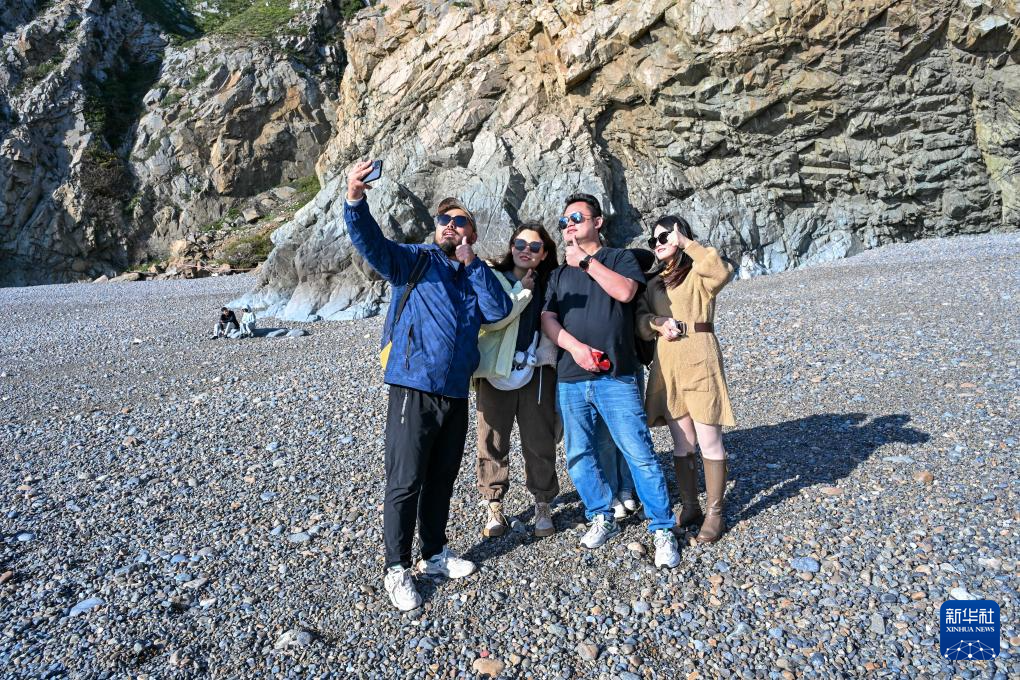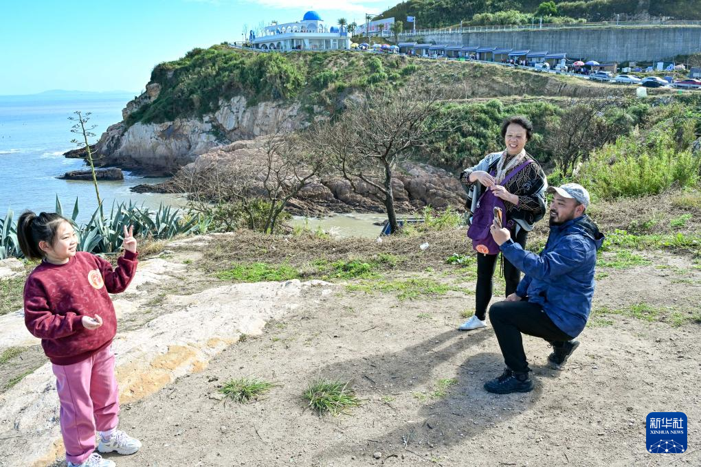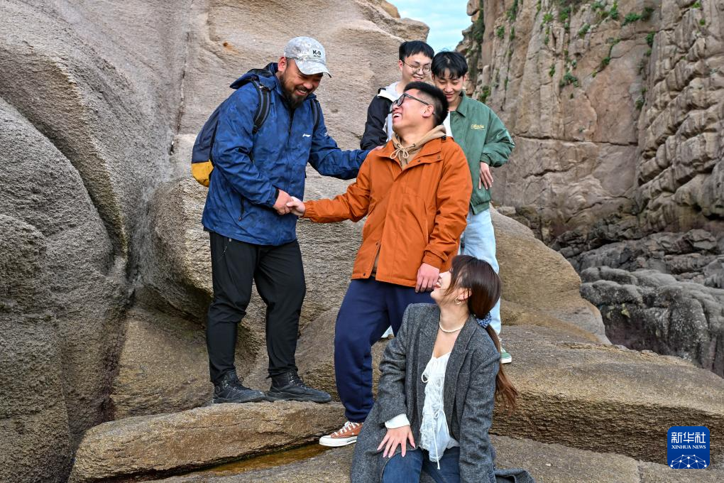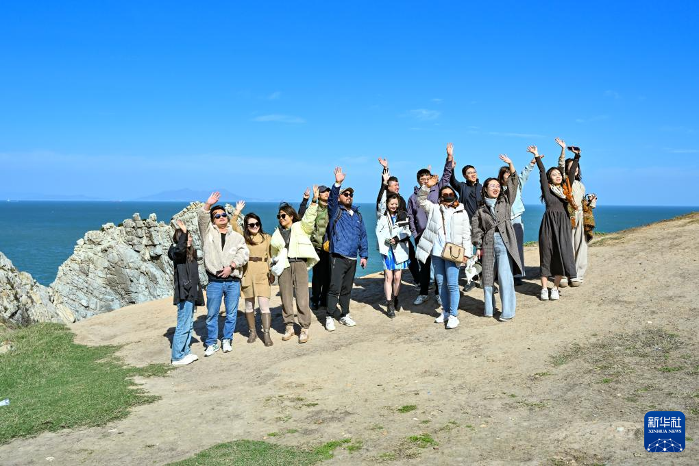 11月29日,在霞浦县海岛乡东礵岛,姜瑜(左六)与游客一起拍摄视频。