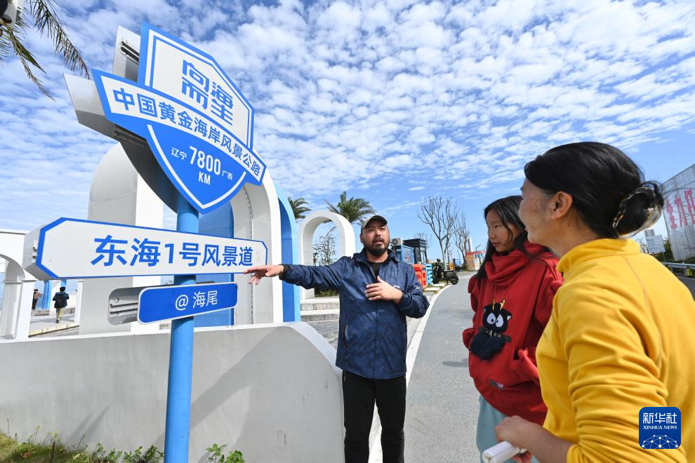 11月30日,在家乡霞浦县长春镇斗米村海尾自然村,姜瑜(左)向游客介绍“东海1号”观光道沿线景点。