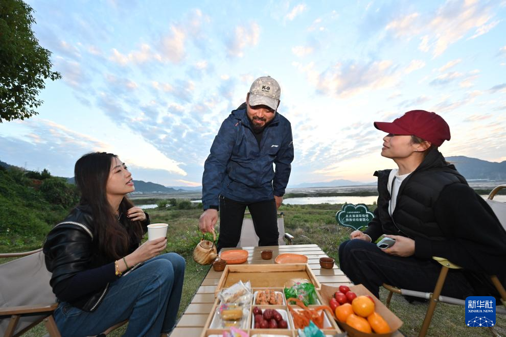 11月30日,姜瑜(中)在自己经营的霞浦县长春镇冬瓜山摄影赶海基地招待游客。