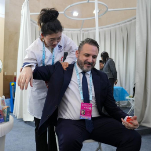 12月3日,在2024世界传统医药大会的中医药体验区,一名来自英国的参会嘉宾(前)在体验中医理疗。