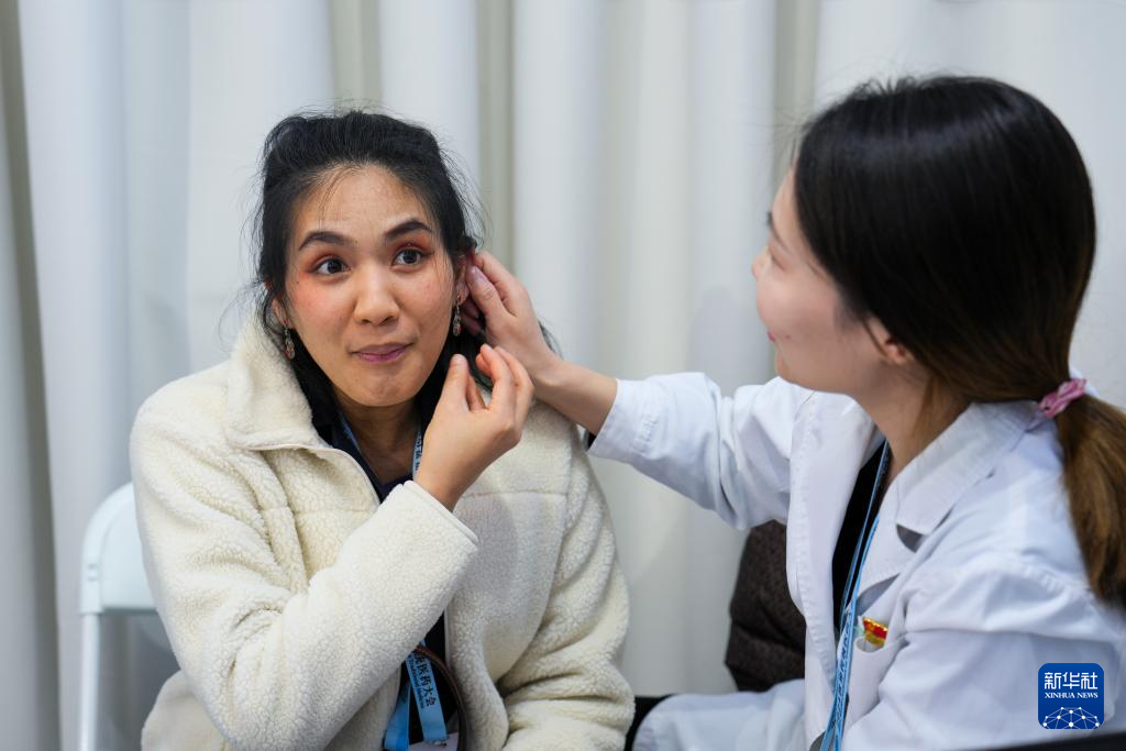 12月3日,在2024世界传统医药大会的中医药体验区,一名来自泰国的参会嘉宾(左)在首都医科大学附属北京中医医院的展位体验耳穴压豆。