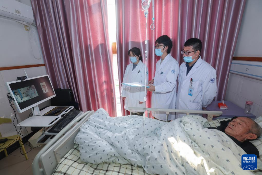 12月3日,在安华镇中心卫生院住院部病房内,医生与诸暨市人民医院专家进行远程会诊。
