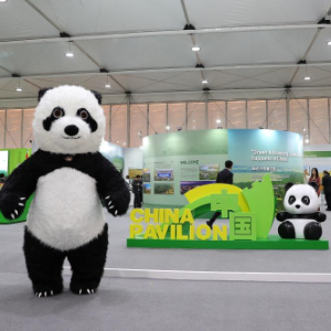 12月2日,在沙特阿拉伯利雅得,人们参观联合国防治荒漠化公约大会中国馆。