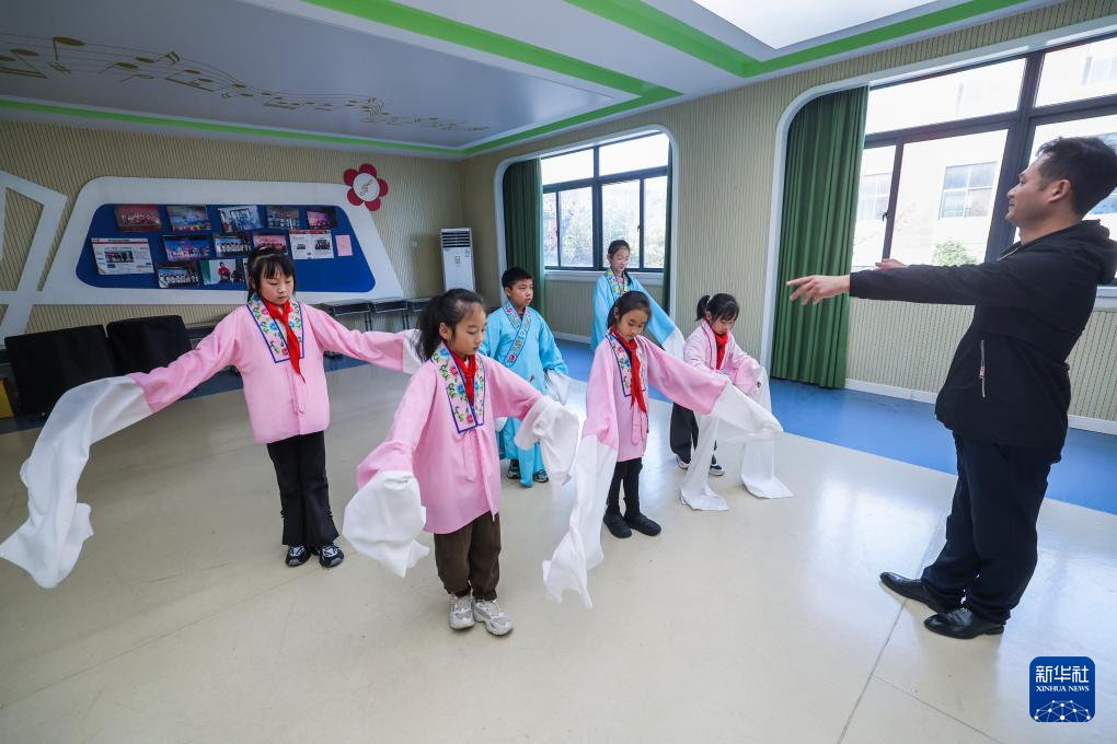 12月3日,在浙江省诸暨市西湖小学,老师在指导越剧社团的学生演员排练。