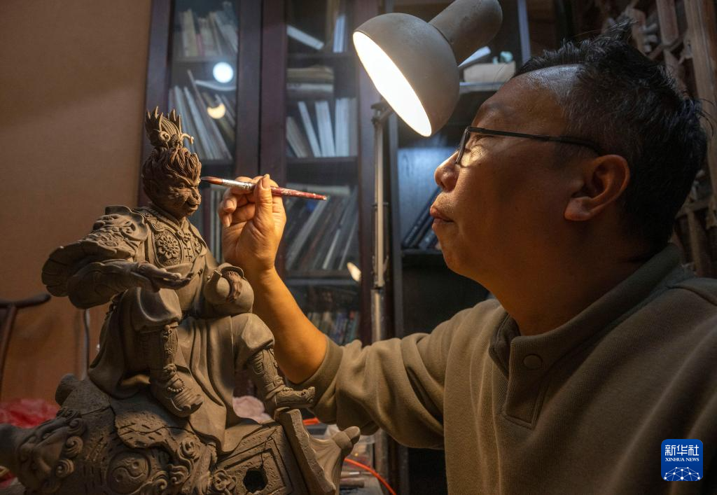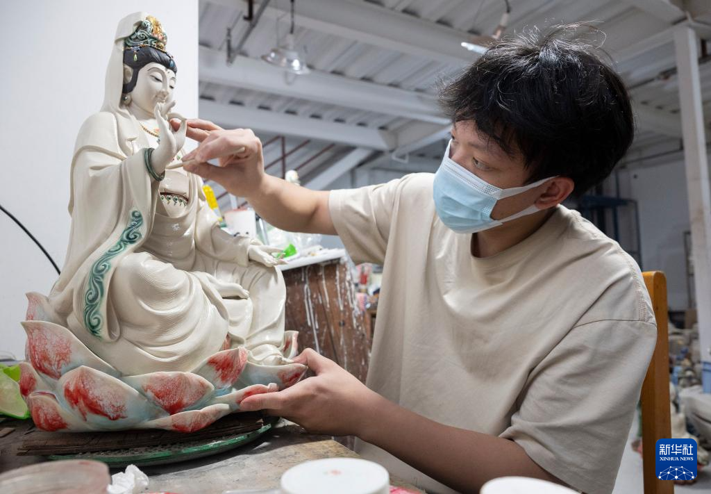 12月3日,在广东省佛山市美陶湾冯志伟陶塑设计室,一名工匠在施釉上色。