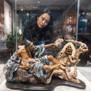 12月3日,在广东省佛山市美陶湾酉物工作室,佛山市陶瓷艺术大师、工艺美术师伍蔚蔚介绍具有现代创意元素的陶塑作品。