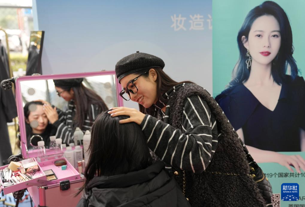 12月4日,化妆造型师在位于杭州电子科技大学的招聘会现场为一名求职者化妆。