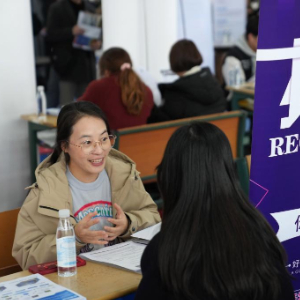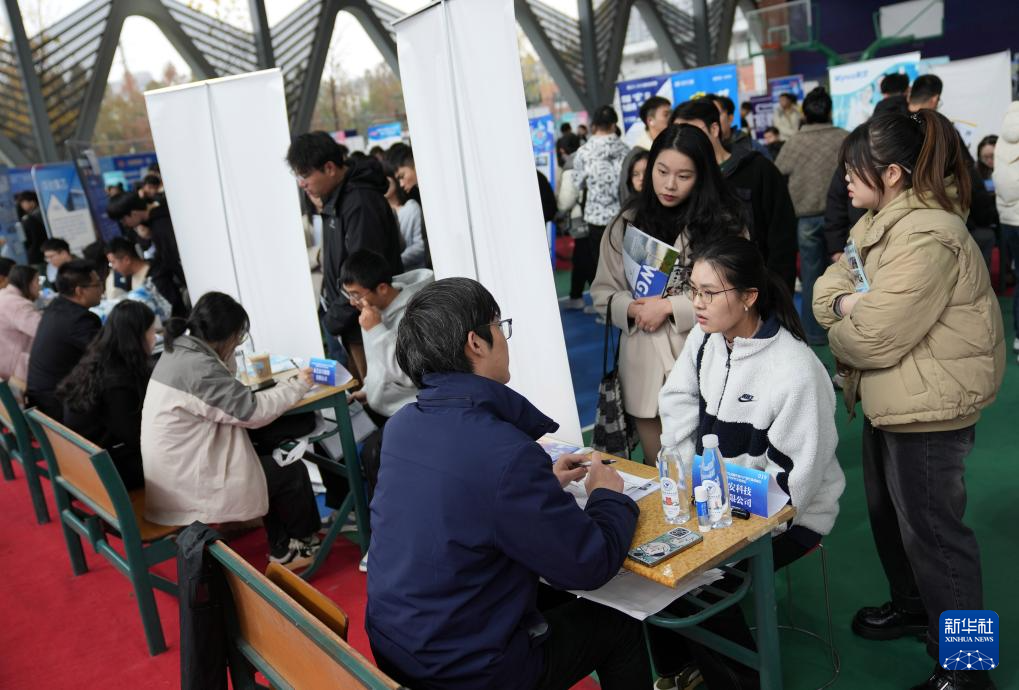 12月4日,一名招聘方代表(左)在位于杭州电子科技大学的招聘会现场与求职者交流。