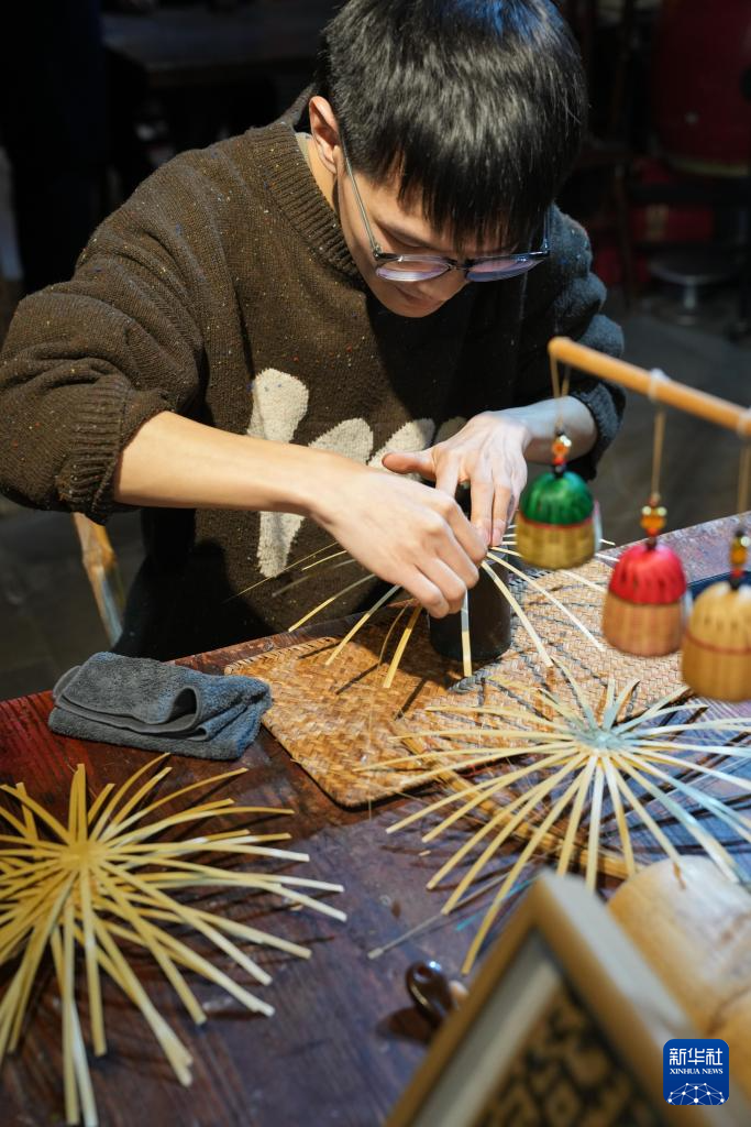 12月4日,手工艺人在鄞州非遗馆内展示竹编技艺。