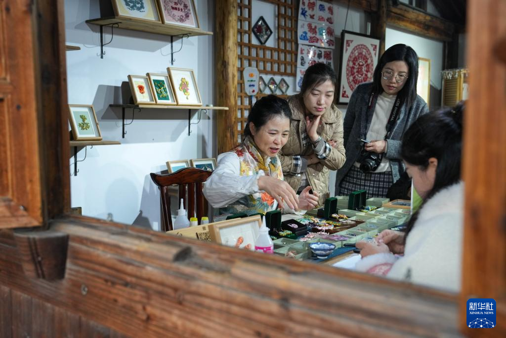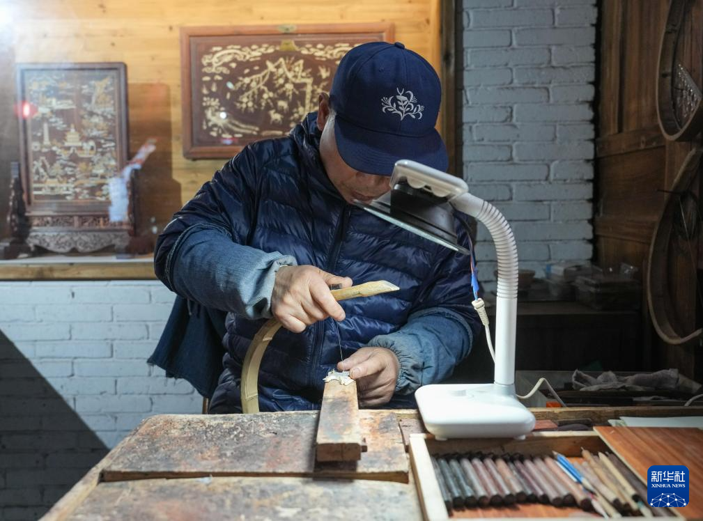 12月4日,手工艺人在鄞州非遗馆内展示骨木镶嵌技艺。