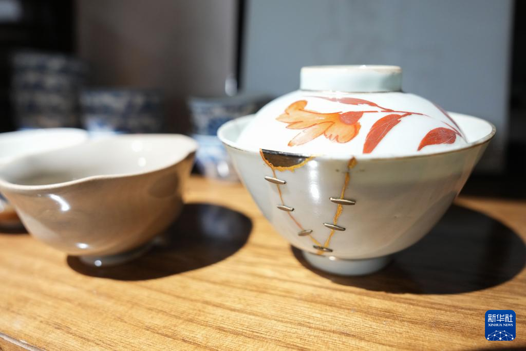 这是12月4日在鄞州非遗馆内拍摄的经过钉碗技艺修补的展品。