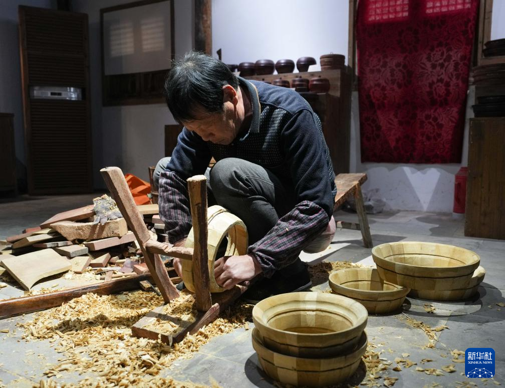 12月4日,手工艺人在鄞州非遗馆内展示箍桶技艺。