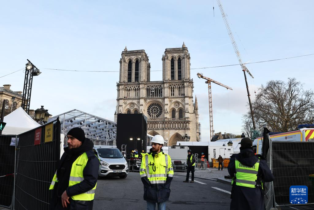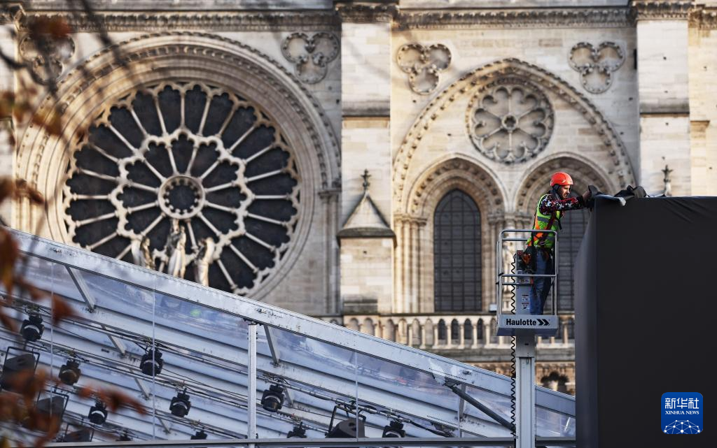 12月4日,在法国巴黎圣母院前,工作人员为重新开放仪式做准备。