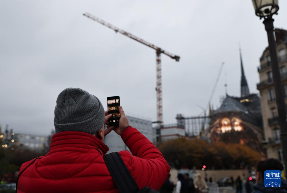 12月4日,一名路人在即将重新开放的法国巴黎圣母院前驻足拍照。