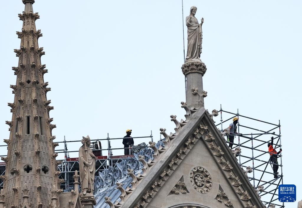 12月4日,工人在即将重新开放的法国巴黎圣母院工作。