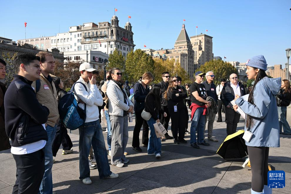 11月30日,外国游客在上海外滩听导游讲解。