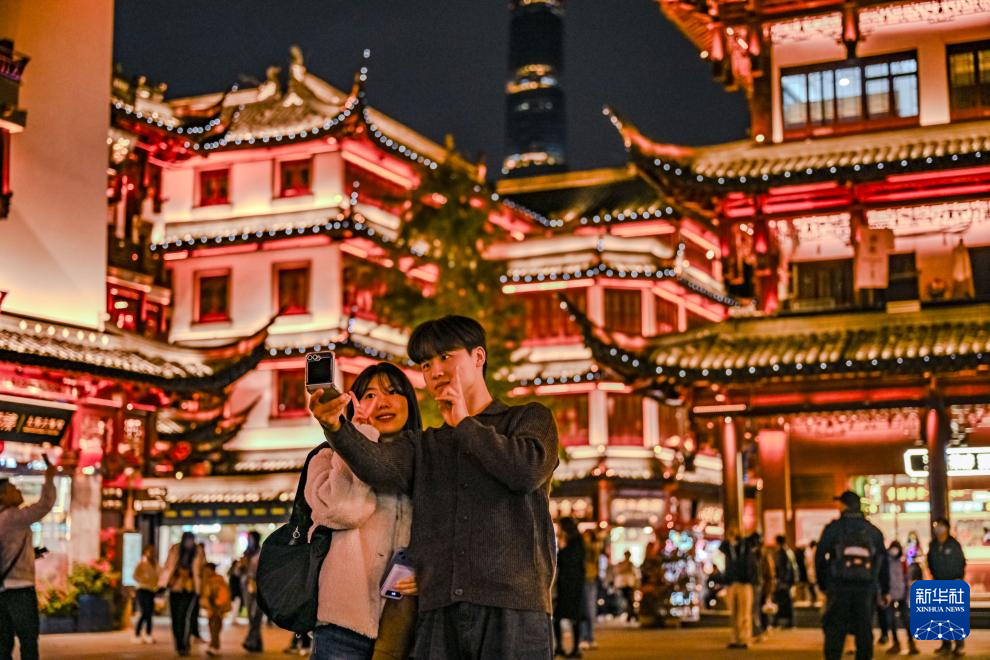 12月4日,来自韩国的游客在上海豫园商城自拍。