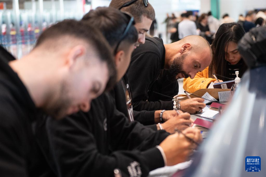 12月4日,外国游客在北京首都机场三号航站楼边检入境现场填写入境卡。