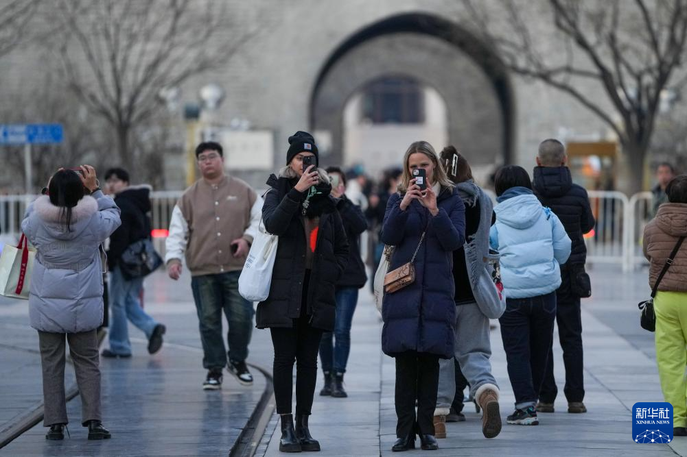 12月5日,外国游客在北京前门大街游览。