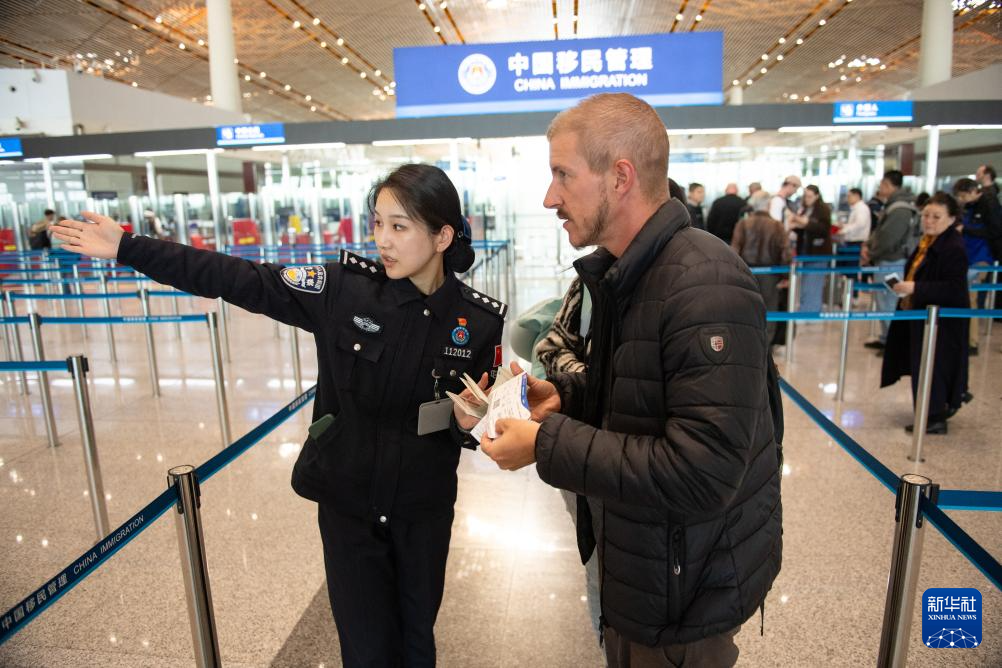 12月4日,边检民警在北京首都机场三号航站楼边检入境现场引导外国游客。