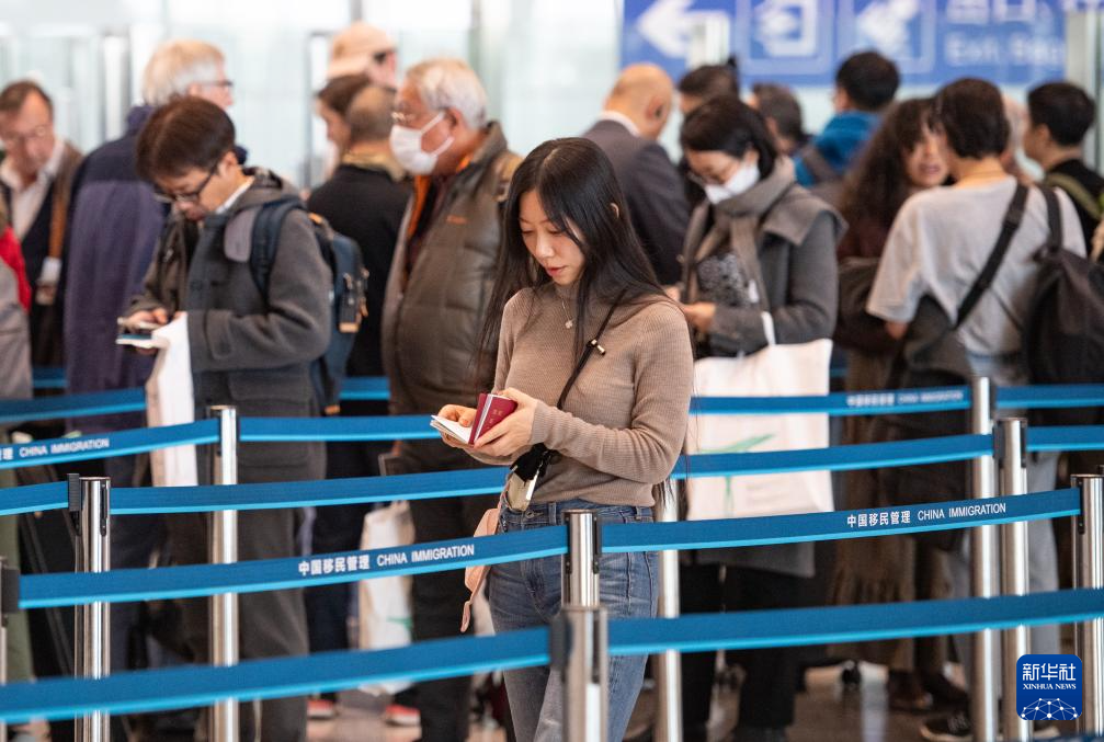 12月4日,外国游客在北京首都机场三号航站楼边检入境现场候检。