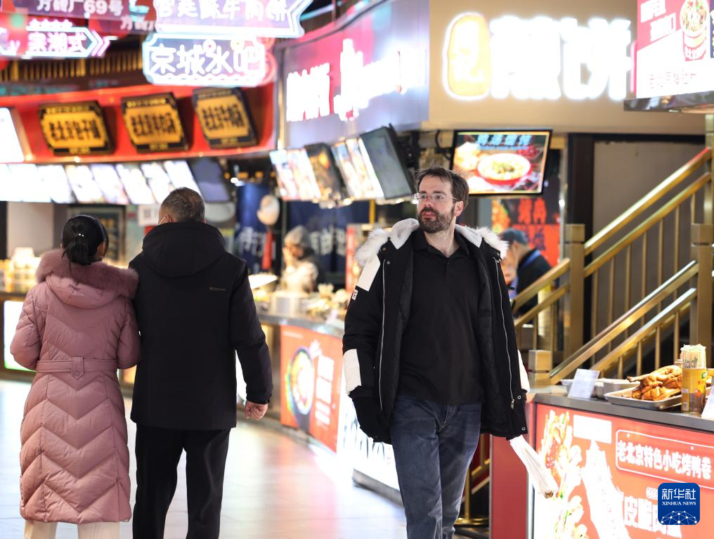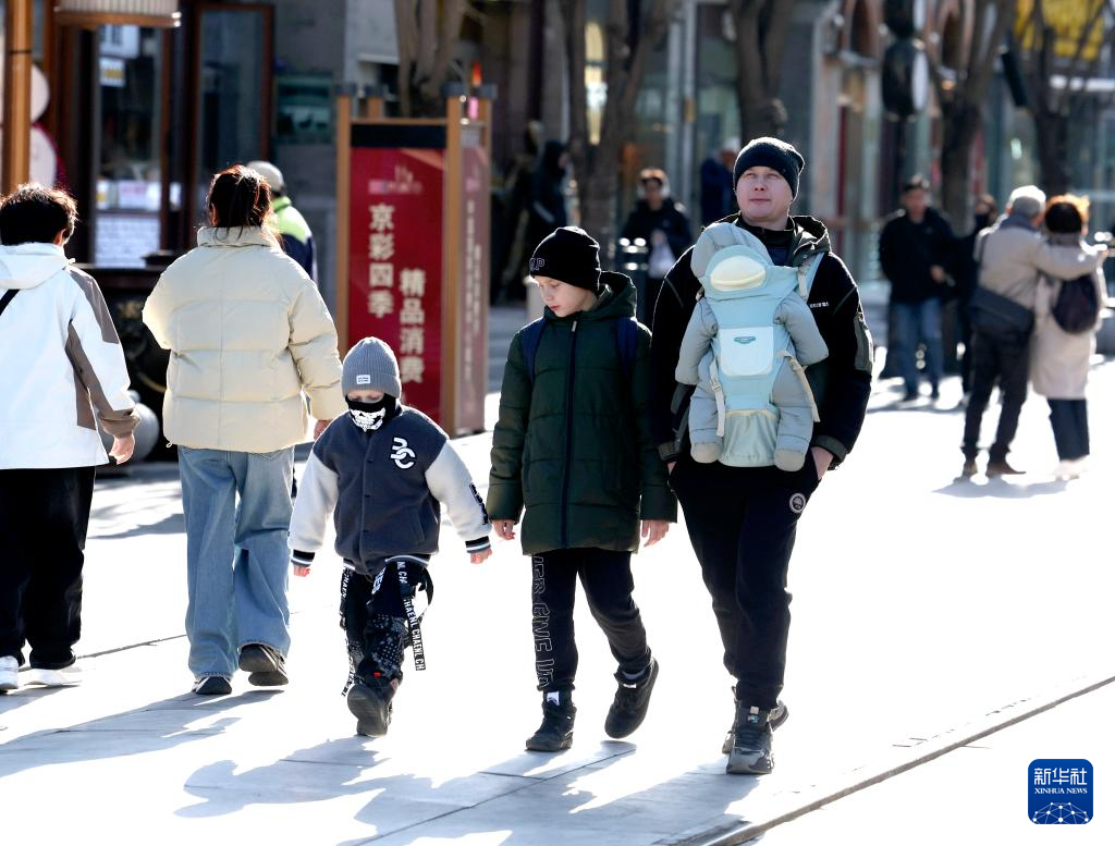 12月5日,外国游客在北京前门大栅栏商业街游览。