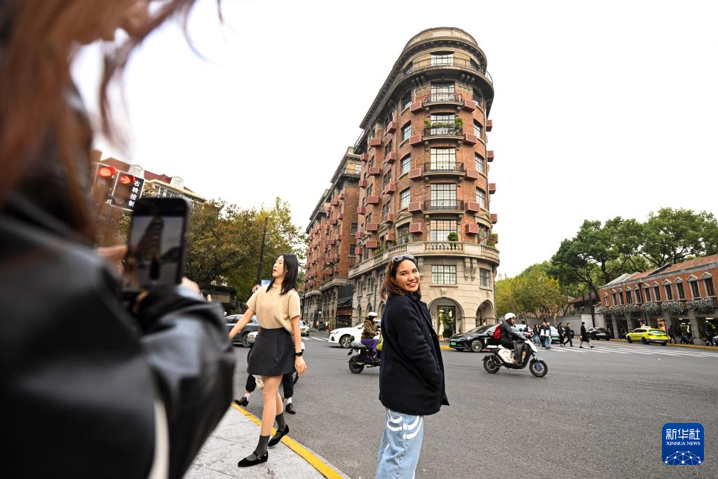 12月3日,来自泰国的游客在上海武康大楼前打卡拍照。