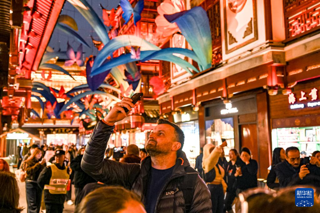 12月4日,来自波兰的游客在上海豫园商城拍照。