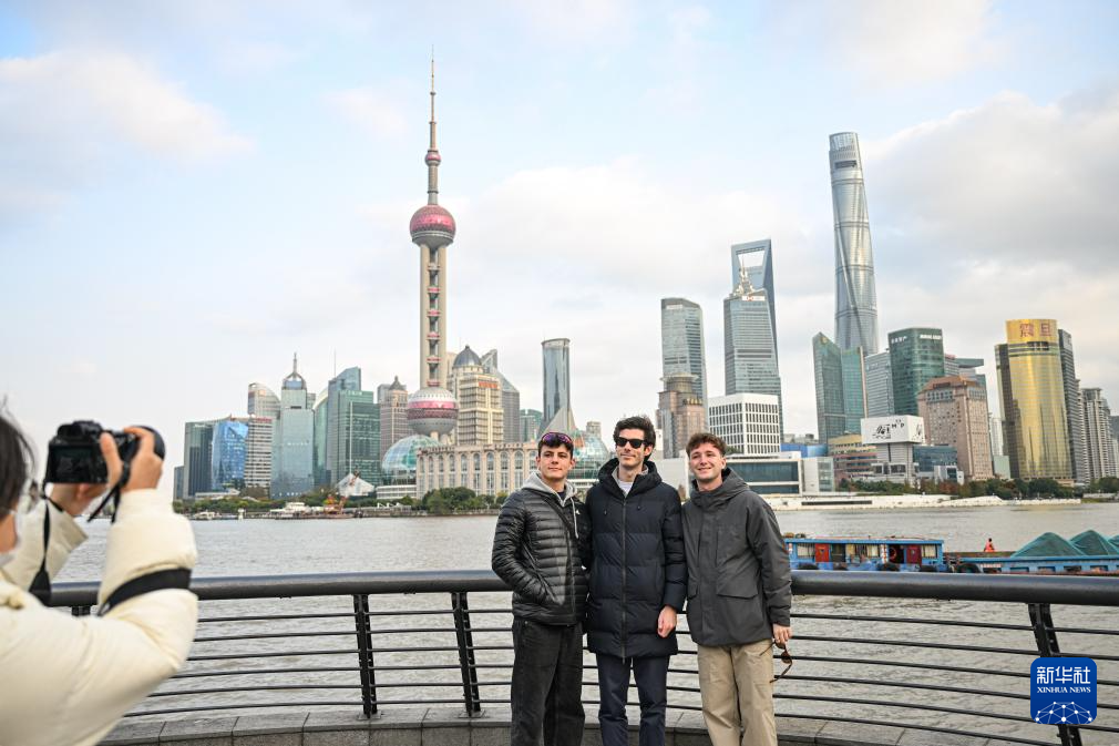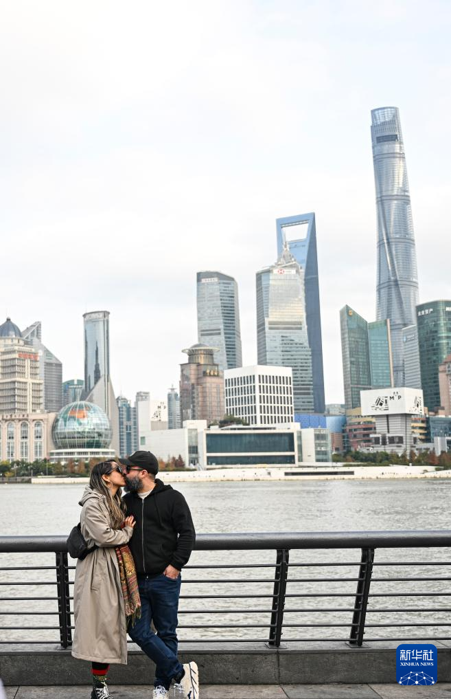 12月4日,来自波多黎各的游客在上海外滩留影。