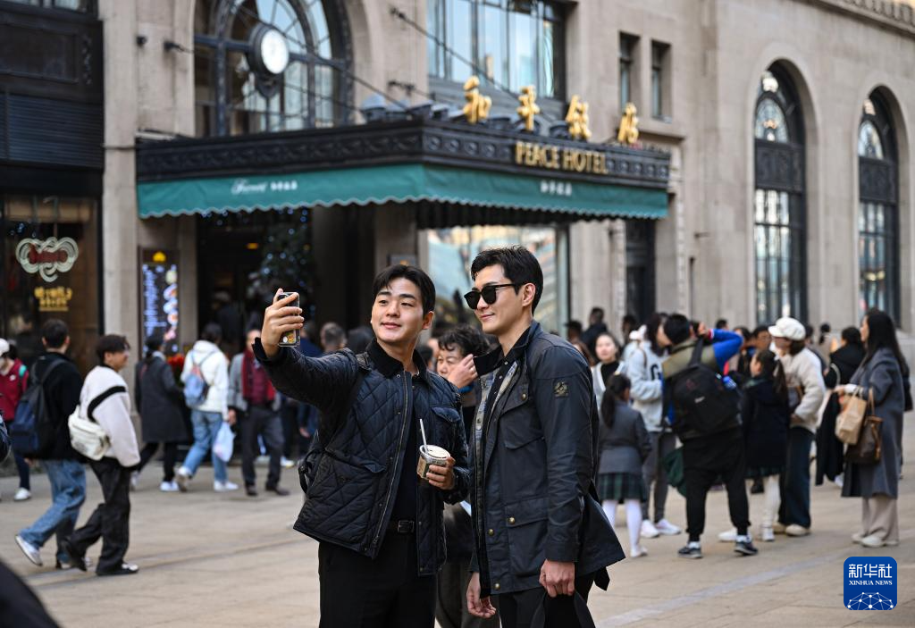 11月30日,在上海市南京路步行街,两名来自韩国的游客在和平饭店前自拍。