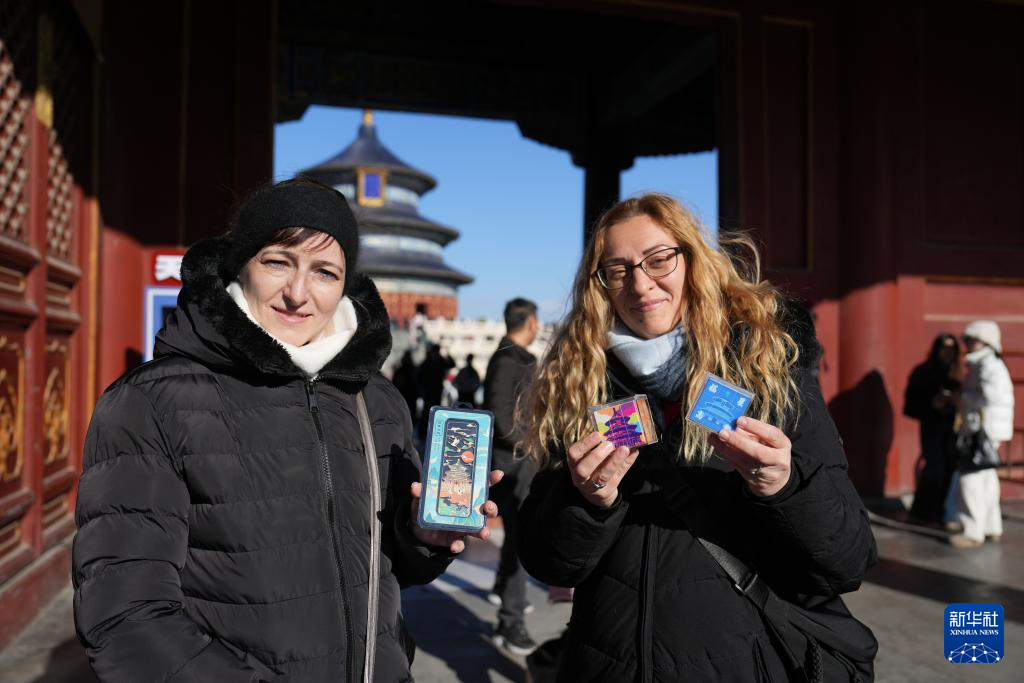 12月5日,两名来自匈牙利的游客展示她们购买的天坛公园纪念品。