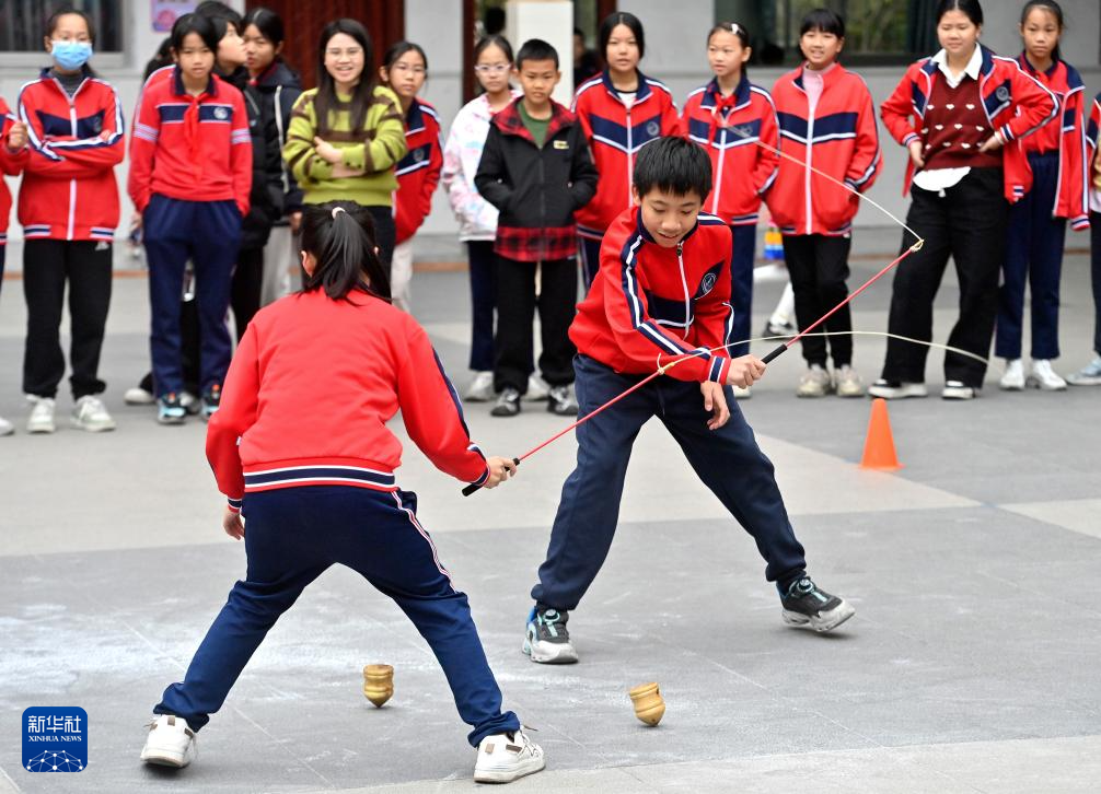 当日,广西梧州市新兴二路小学举行民族体育运动会,比赛设有抛绣球、大象拔河、陀螺、板鞋接力、竹竿舞、跳绳等十多个项目。学生们在运动会中尽享民族传统体育运动带来的快乐。