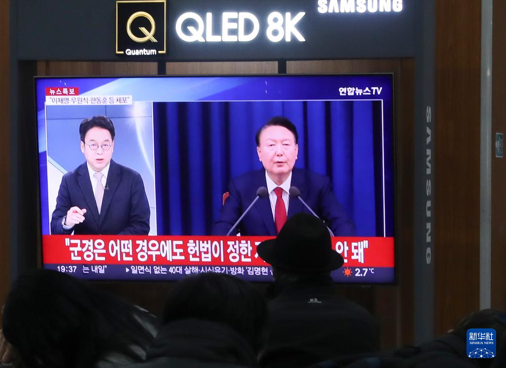 12月6日,在韩国首尔火车站,韩国民众观看关于韩国政局的新闻。