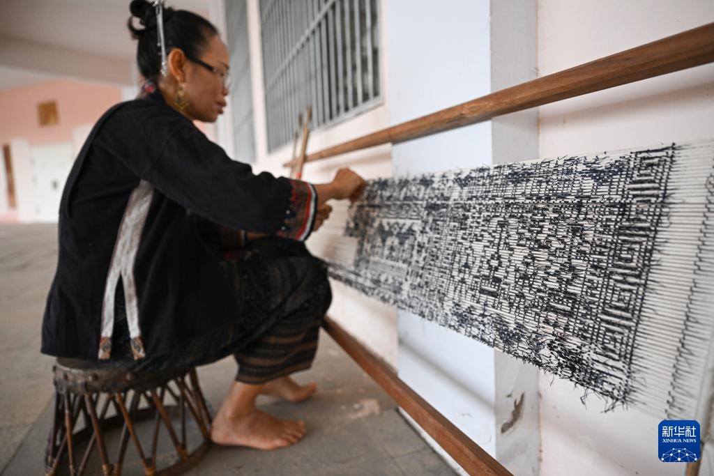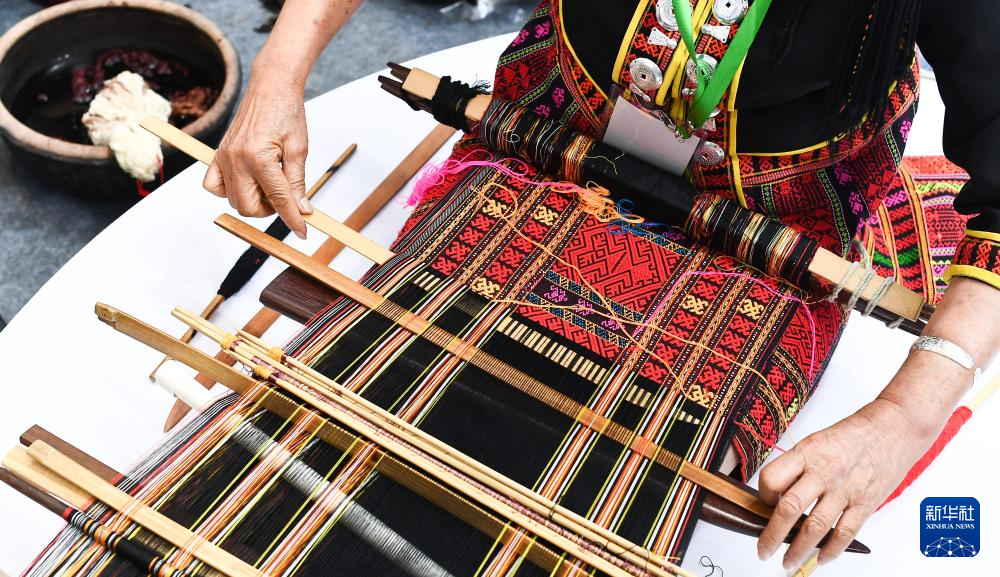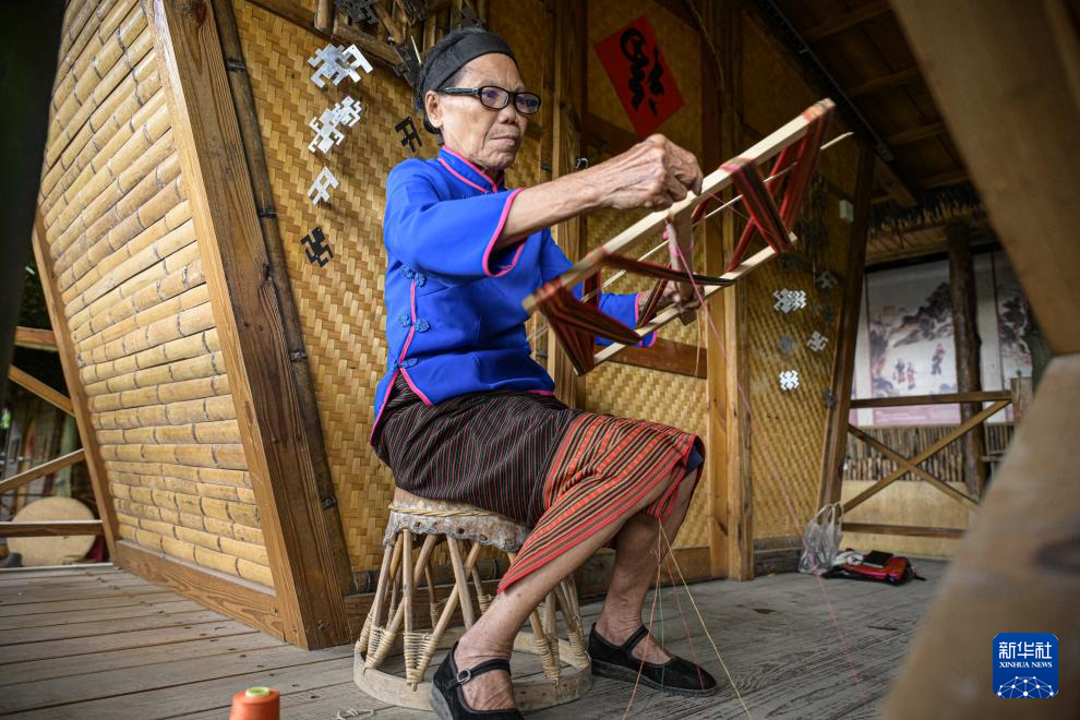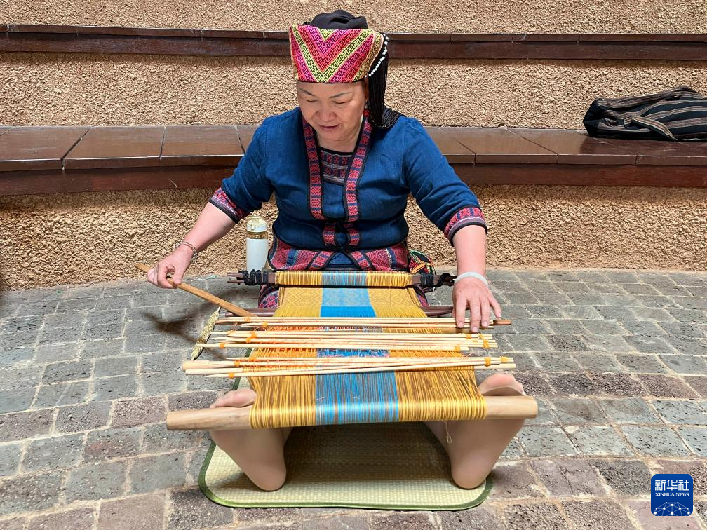 黎族传统纺染织绣技艺省级传承人符永英在海南东方市黎族传统纺染织绣技艺传承馆展示技艺(2023年6月6日摄)。