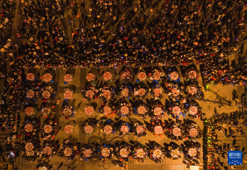在四川省北川羌族自治县禹王广场,当地群众摆出坝坝宴,欢庆羌历新年(2020年11月14日摄,无人机照片)。