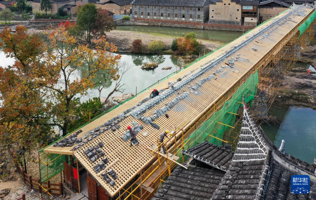 在福建省屏南县长桥镇,工匠们在修复万安桥时吊装瓦片,铺设廊屋屋顶(2023年11月29日摄)。