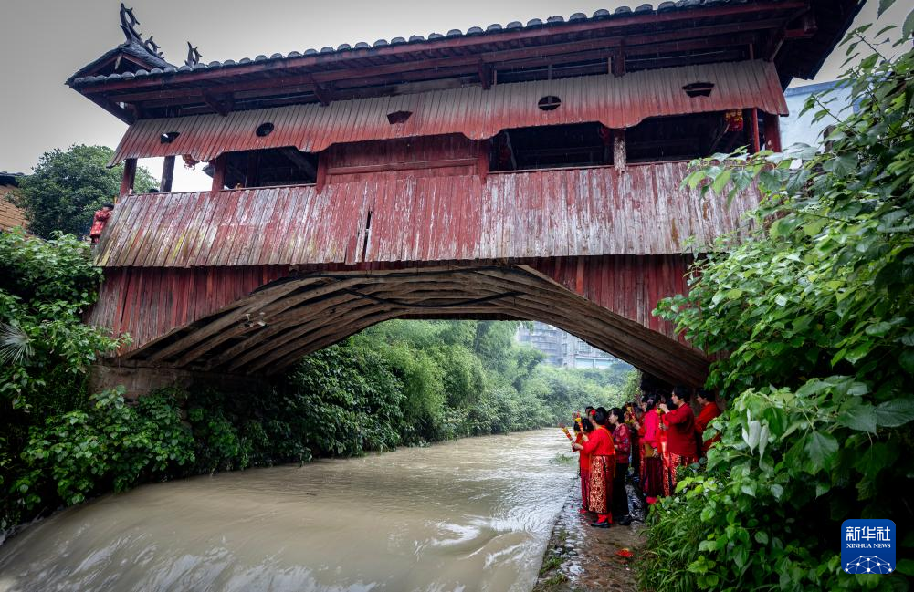 村民在浙江省丽水市庆元县古廊桥双门桥参加非遗端午走桥民俗活动(2024年6月11日摄)。