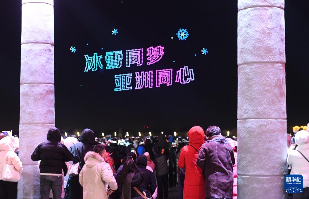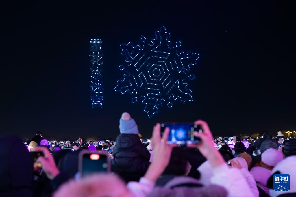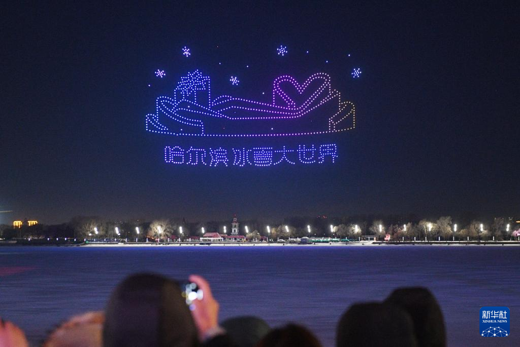 12月6日晚,松花江哈尔滨段上空上演无人机光影秀,为即将到来的第五届哈尔滨采冰节和第二十六届哈尔滨冰雪大世界预热,吸引众多市民和游客前来观看。