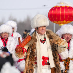 12月7日,在第五届哈尔滨采冰节现场,“冰把头”带领“采冰汉子”去采头冰。