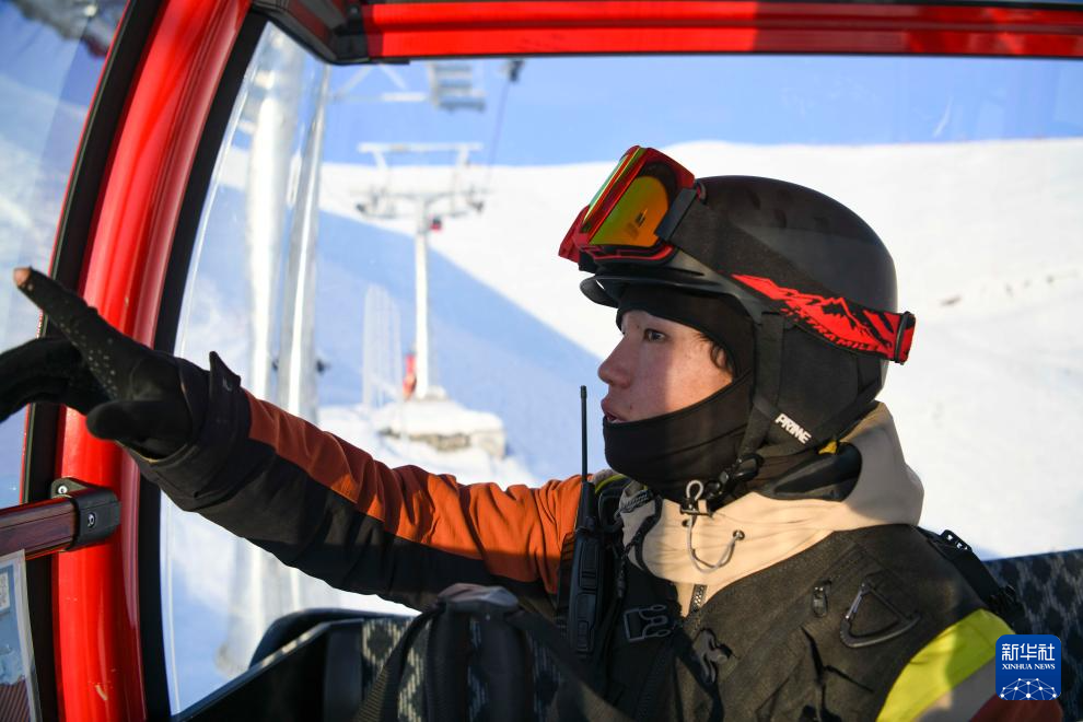 12月3日,滑雪巡救员满德力乘坐缆车前往巡逻区域。