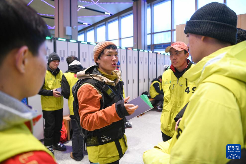 12月3日,在吉克普林国际滑雪度假区东区服务大厅,满德力(中)向小组成员叮嘱当日巡救工作要点。