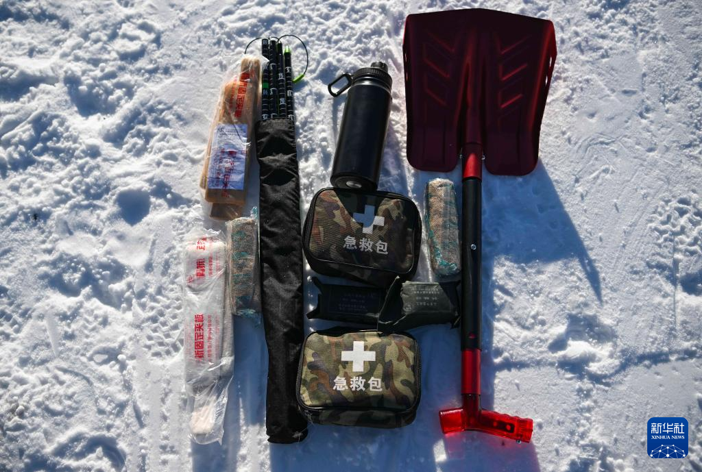 这是满德力巡逻时携带的急救包、骨折固定夹板、雪铲等物品(12月5日摄)。