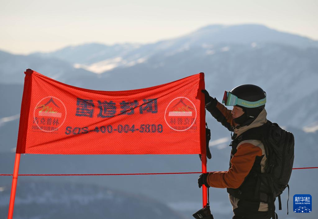 12月4日,满德力在一处雪道入口处架设安全警示牌。