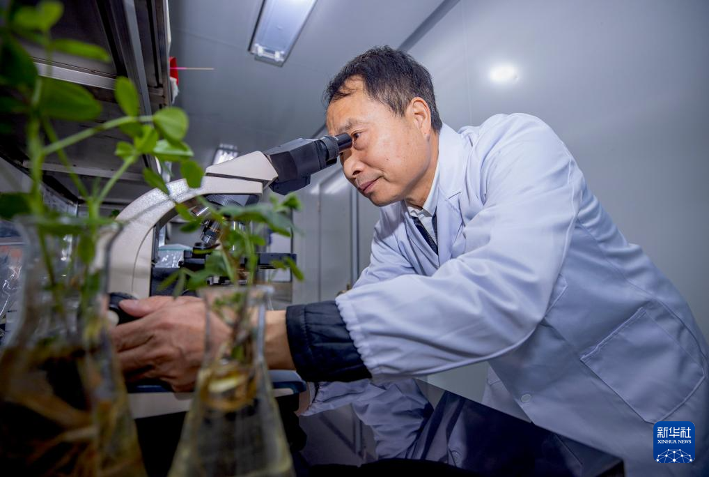 12月6日,杨国平在实验室通过显微镜查看抗盐碱微生物的实验情况。