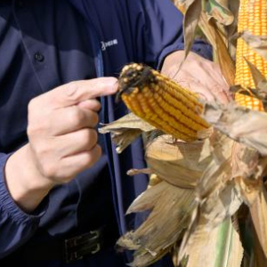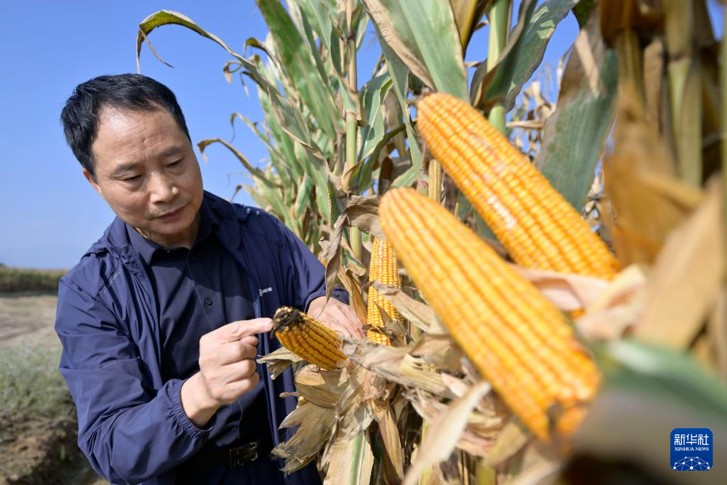 杨国平教授在查看盐碱地种出的玉米生长情况(10月12日摄)。