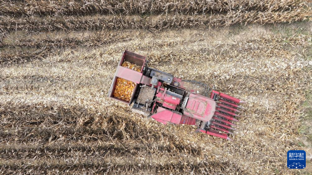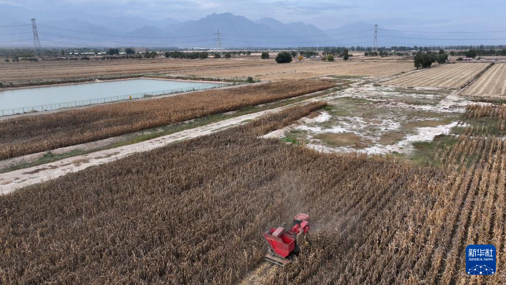 北方民族大学杨国平团队通过微生物方式治理过的盐碱地上种植的玉米已收获(10月12日摄,无人机照片)。