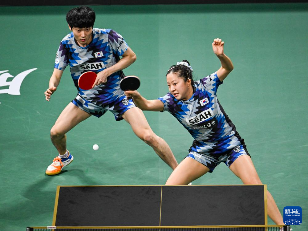 12月8日,韩国队组合赵大成/申裕斌(右)在混双比赛中。最终,他们1比2负于中国队组合王楚钦/孙颖莎。
