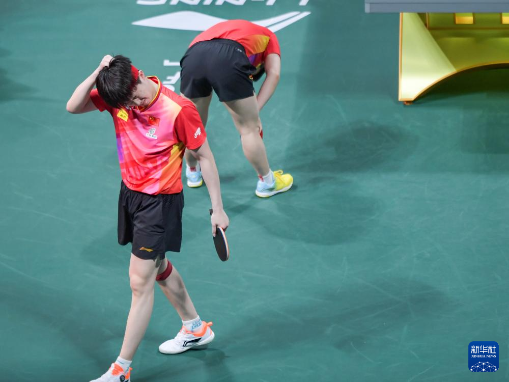 12月8日,中国队组合王楚钦(左)/孙颖莎在混双比赛中。最终,他们2比1战胜韩国队组合赵大成/申裕斌。