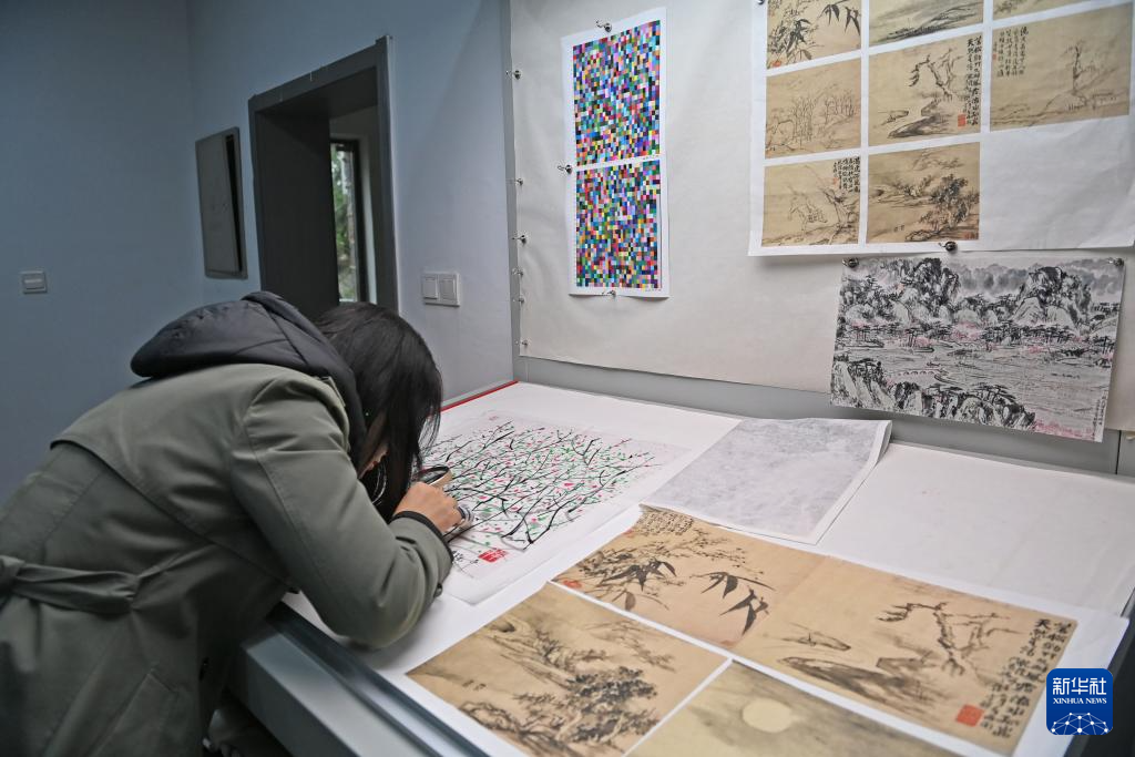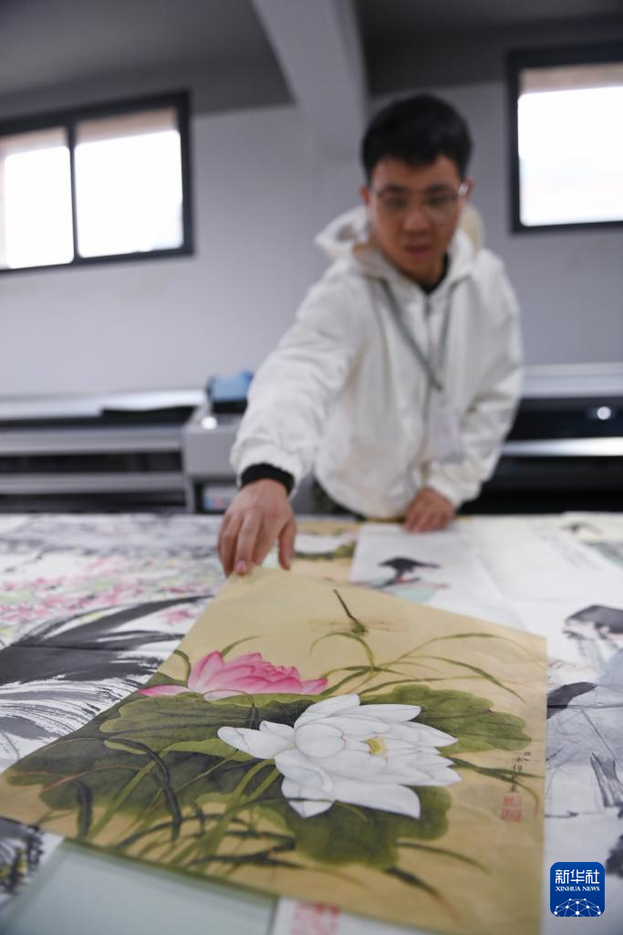 12月7日,浙江青初文化科技有限公司的工作人员在展示特殊墨水打印的水墨画作品。